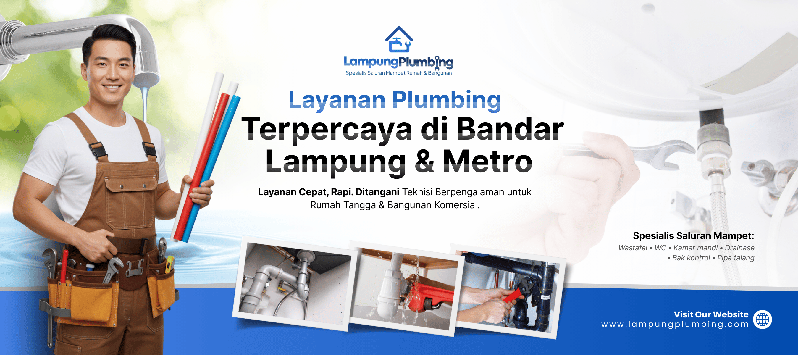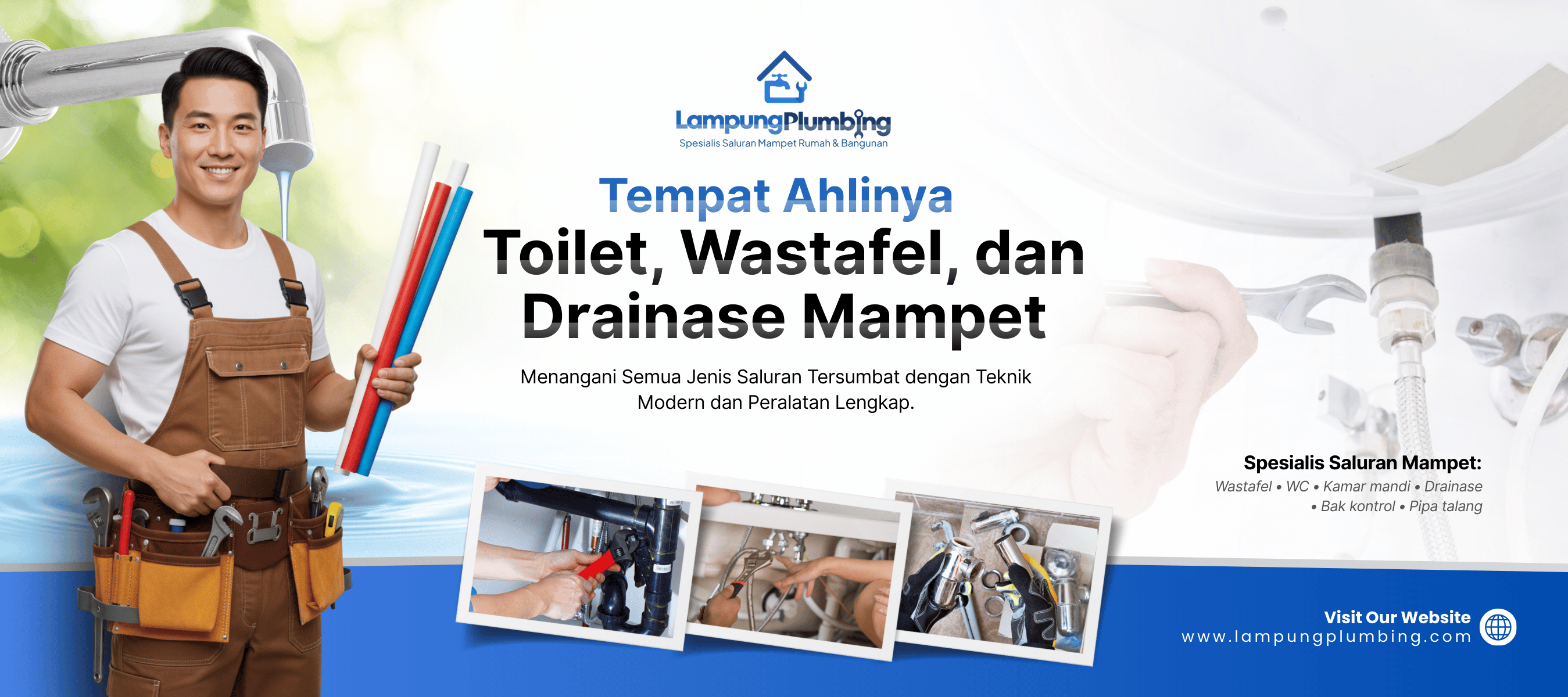 Lampung Plumbing adalah layanan spesialis perbaikan saluran air mampet yang melayani wilayah Bandar Lampung, Kota Metro, dan seluruh Provinsi Lampung. Kami menangani berbagai masalah saluran rumah tangga maupun bangunan komersial, mulai dari WC mampet hingga drainase yang tersumbat. Setiap pekerjaan dikerjakan oleh teknisi berpengalaman dengan hasil cepat, rapi, dan seminim mungkin tanpa bongkar.